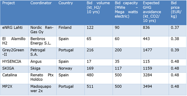 Evropská komise zveřejnila seznam vítězných nabídek; rozhodla o podpoře 7 projektů (viz tabulka níže). Vybrané projekty dohromady pokryjí kapacitu elektrolyzérů o výkonu 1,5 gigawattů (GWe) a během deseti let vyprodukují celkem 1,58 milionu tun obnovitelného vodíku. Předložené nabídky se pohybovaly od 0,37 eur do maximální ceny 4,5 eur za kilogram vyrobeného vodíku. Projekty, které byly nakonec vybrány, předložily nabídky v rozmezí od 0,37 do 0,48 eur za kilogram vyrobeného obnovitelného vodíku. Vítězné projekty obdrží dotaci z Inovačního fondu v rozmezí od 8 do 245 milionů eur. Ta by jim měla pomoci překlenout cenový rozdíl mezi jejich výrobními náklady a tržní cenou vodíku, která nyní v EU panuje na trhu s vodíkem, který ale nesplňuje kritéria tzv. RFNBO vodíku. Očekává se, že dohody o dotaci budou s výherci aukce podepsány v listopadu 2024. Předkladatelé pak budou muset začít vyrábět obnovitelný vodík nejpozději do pěti let od podpisu dohody o dotaci. Vítězné projekty nicméně počítají se zahájením výroby do konce roku 2027.